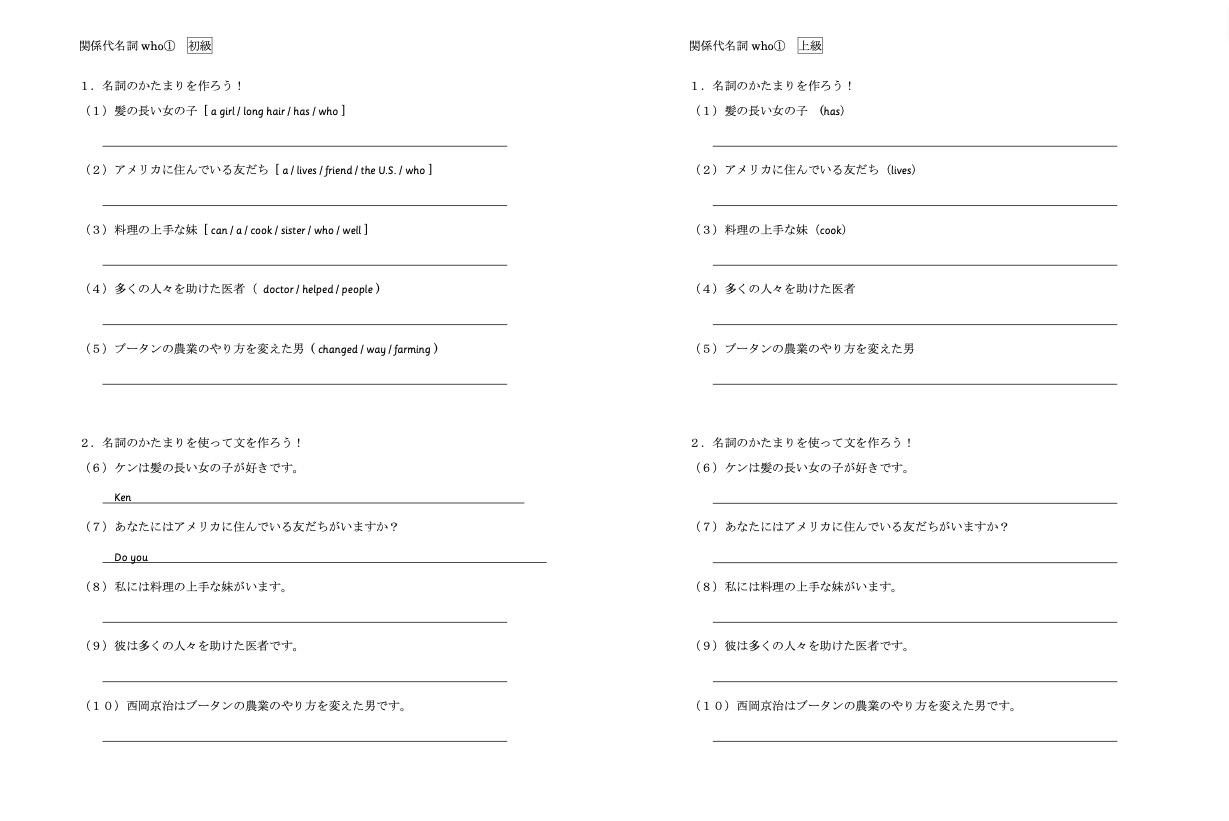 作り方はシンプルで、例えば「関係代名詞 who」だったら、初級と上級の2種類の問題を用意し、以下のように左右に並べて一枚に印刷します。