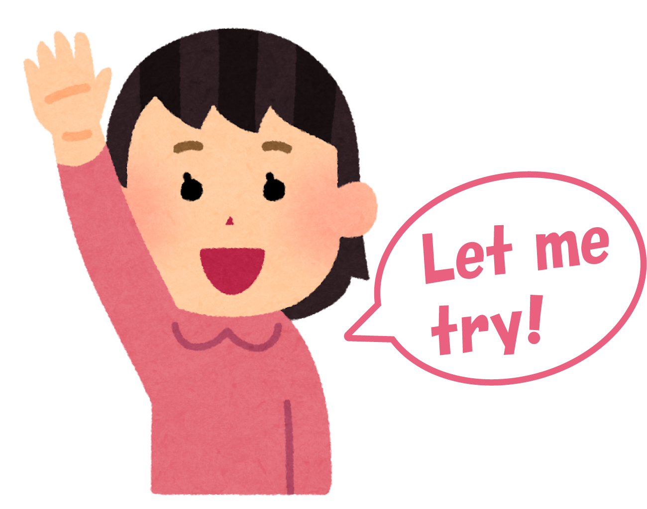| 1 | Let me try. | その問題、私にやらせて! | ||||