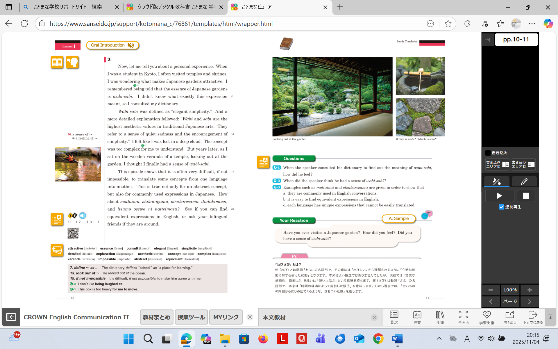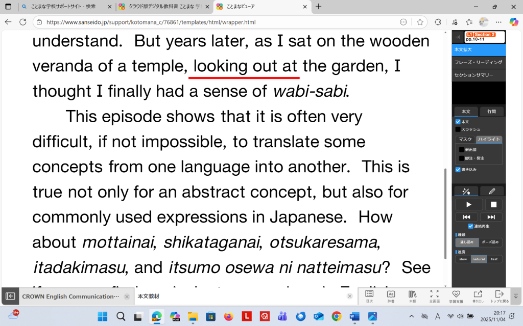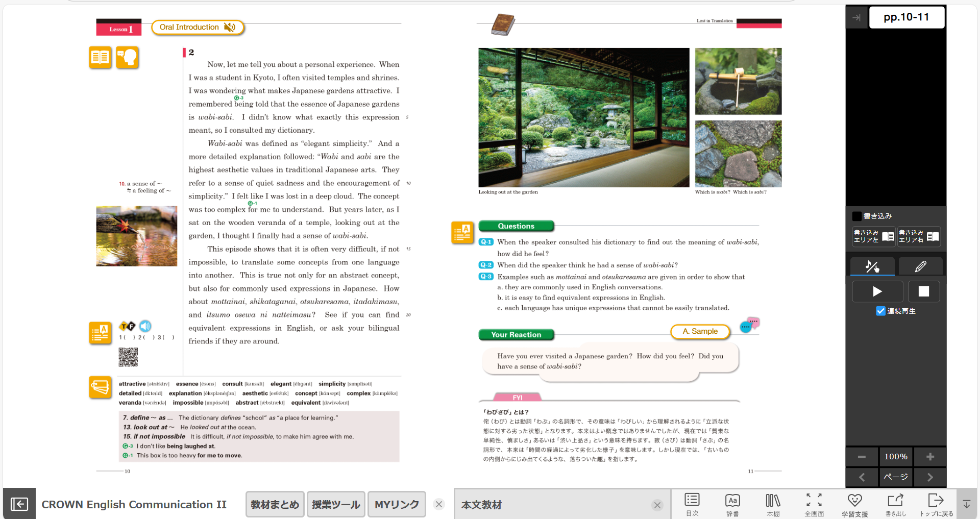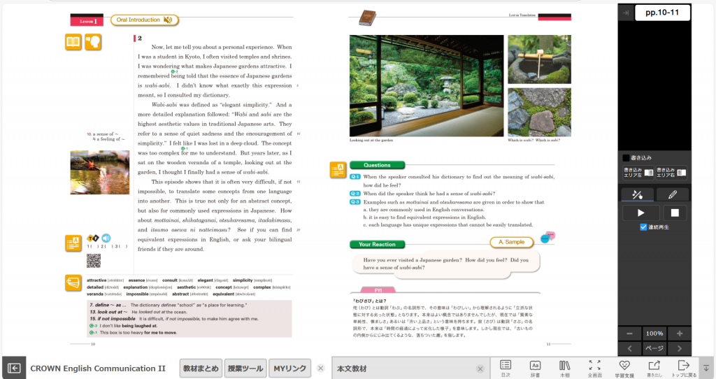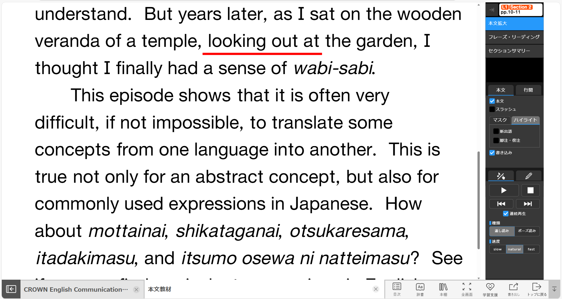『CROWN English Communication II』を使用して英語コミュニケーションⅡの授業を展開する中で、いわゆる句動詞(phrasal verb)を見かけることがある。例えばLesson 1のChapter 2で ‘But years later, as I sat on the wooden veranda of a temple, looking out at the garden, I thought I finally had a sense of wabi-sabi.’ という文が出てくる。この中で、 ‘look out at ~’という表現がページ下で取り上げられて説明されている。一見すると、 ‘look out at ~’という表現が1つの完成品であるかのような印象を与える。実際そのような捉え方もできるが、私が授業でこのような表現を扱う際は、必ず生徒に「省エネ」を呼びかける。「省エネ」とはつまり、「丸暗記をするな」という意味である。「lookは見る動作、outは内から外へ視線が向いていて、atは点のイメージだから、視界の中のある1点を見ている」というような説明をする。ここで登場している ‘out’や ‘at’ のイメージを持っていれば、 ‘look out at ~’という完成品としての句動詞を知らなくても意味の推察はできるし、自分が実際にアウトプットする際も、自分で表現を作ることができるという可能性につながってくる。一方で丸暗記のサイクルだと、アウトプットの際もその表現を知っているか知らないかでアウトプットできるかどうかは決まってしまう。丸暗記では、せっかく学習した表現を使う際に、英語学習者にとっては非常にハードルが高くなってしまうと私は思うのだ。