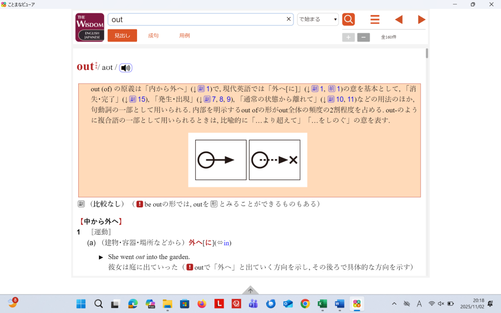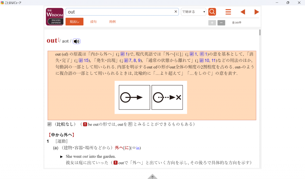 英語学習を進めていると、句動詞(のようなもの)に出会う機会はとても多い。多いが故に、そのすべてを「丸暗記せよ」というのはやはり無理がある。そこを打開するための方法として、これまで「知っている」「分かっている」という印象がある ‘up’のような語について、辞書であらためて調べて理解を深めることは、英語学習者が句動詞をマスターしていく上で必ず一助になると考える。このような句動詞へのアプローチを進める上で、教科書『CROWN English Communication II』は‘look out at ~’やlook up at ~’のように相互に関連する表現を一つのレッスンのなかで取り上げており、授業ではとてもスムーズな流れで句動詞についての理解を深めることができる。同時に、『ウィズダム英和・和英辞典』は ‘up’のような語についても生徒のレベルに合ったシンプルで適切な説明と用例を与えてくれるため、生徒も無理なく自分の表現の幅を広げることができる。生徒は若いので丸暗記も可能かもしれないのだが、人はやがて老いるので(と生徒にも常日頃話している)、できるだけ「省エネ」しながら英語学習を進めてもらいたいと考えている。