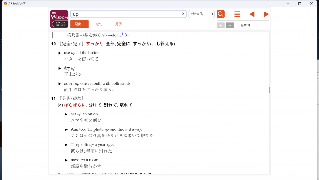 最初の項目には「上方へ、高いところへ」という、生徒が最もよく知っている意味が表示される。しかしそのまま次々と項目を調べていくと、10番目に「すっかり、全部、完全に」という意味が表示され、 ‘use up’, ‘dry up’, ‘cover up’, ‘finish up’というような用例が紹介されている。
