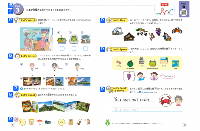 そして、Let’s PlayやLet’s Speakでは、伝え合う活動を中心に展開することができます。ここで大切にしたいのは、「もどれる」ことです。指導者は「教えたから、使えるだろう」と思ってしまいがちですが、教室には一定数、うまく伝え合う活動を進められない子どももいます。そのような場合に、どこを参照すればよいかを明確にしておくことが重要です。PanoramaやLet’s Watch、Let’s Listenに「もどりながら」伝え合う活動に取り組むことを意識したいところです。子どもたちが「もどる」ことができるのは、STEPの強みです。学習状況に応じて活用を促していきたいですね。