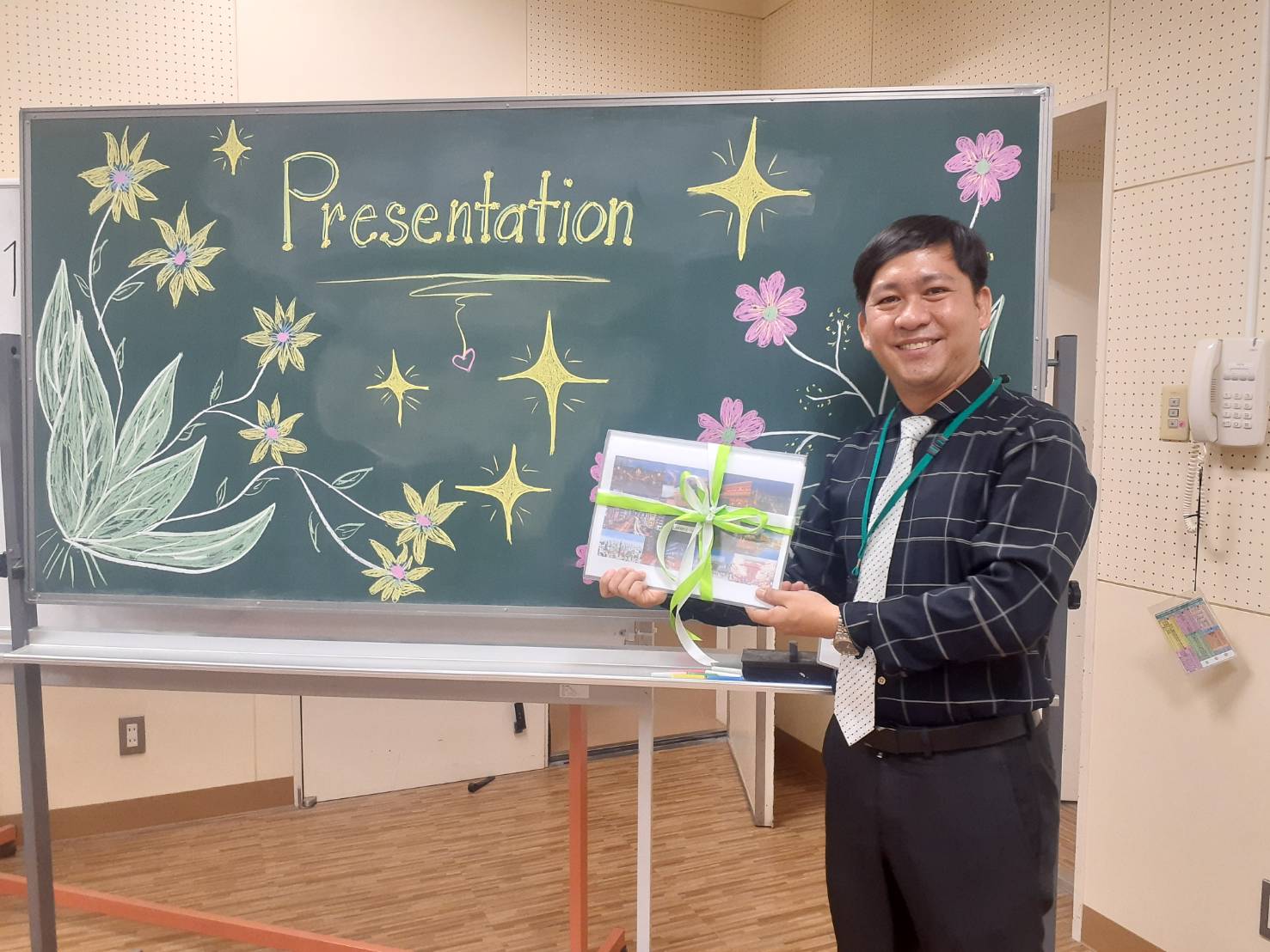 発表後、児童たちは一冊に綴じたガイドブックをローレン先生にプレゼントしました。先生が「This is so wonderful! I’ll use this everywhere!」と喜ぶ姿を見て、児童たちは自分たちの英語が通じた喜びと、地域の魅力が伝わった達成感を深く味わっていました。