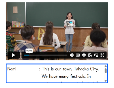 次に、教科書の二次元コードを活用し、JUMP(最終目標)のモデル動画を視聴させました。動画の中で、登場人物が地域の行事を生き生きと紹介する姿を見ることで、児童は「自分もこんなふうに英語で紹介してみたい!」という明確なイメージを持ちます。ここで、児童はワークシートに「ローレン先生が驚くような、写真いっぱいの観光ガイドブックを贈る」という自分なりの「My Goal」を記入し、学習の見通しを立てました。