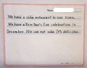 児童の発表例:「We have a big star festival in July. It is beautiful! Please come to our town!」 ローレン先生の反応:「Oh, star festival! I want to go!」 |