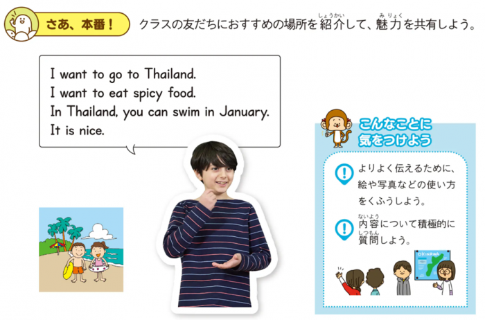 今回のハブ先生の実践では、クラスの友達やALTにおすすめの場所を紹介することでした。もちろん、それだけでも単元の構成としては機能します。ただ、活動を重ねる度に「ただ発話しているだけ」の状態に陥る可能性もあります。単元の終盤に相手を変えることも「見方・考え方」を働かすきっかけになります(例:保護者や遠くに住む同年代の子どもたちなど)。