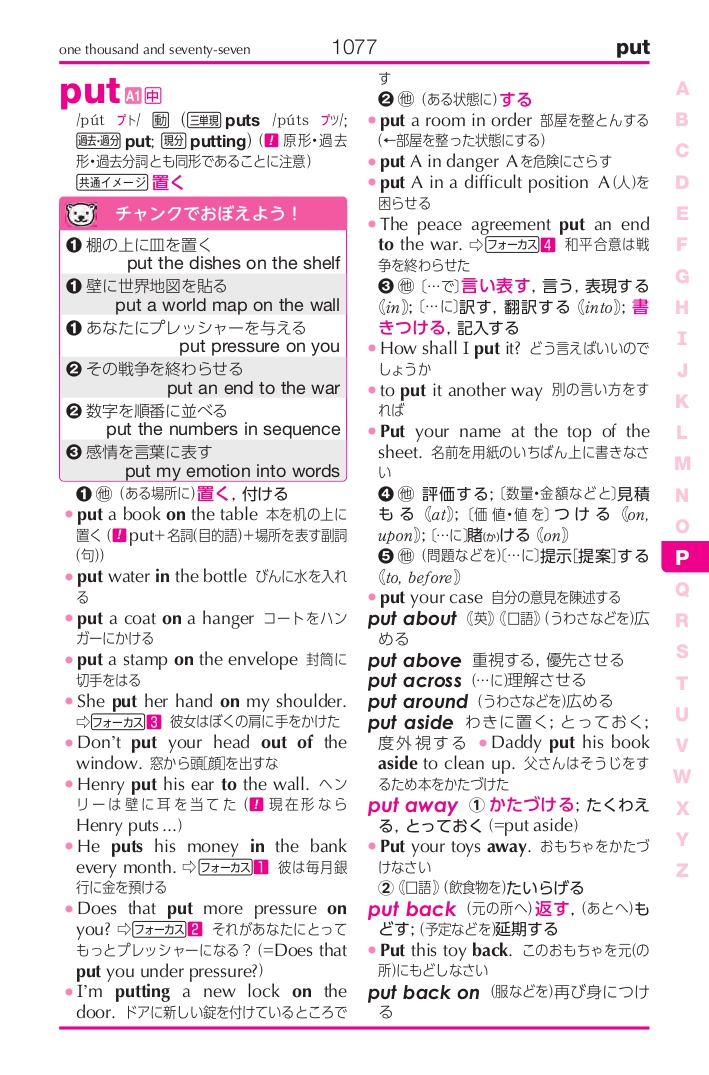 辞書を読む時に、「意味」以外の項目にも注目させるのは誰しもがおっしゃることでしょうが、それを英語の初学者である生徒が実践するのは難しいのが現実です。その点、『エースクラウン英和辞典』は初学者にも読みやすい工夫が随所にあります。その中でも個人的に優れていると思う点をご紹介させていただくと、①「意味マップ」により様々な意味を表す基本単語の全貌が見えやすい、②「チャンクで覚えよう」「使えるコーパスフレーズ」「コロケーション」など基本単語周りの一つの意味のまとまりとして覚えておくべきフレーズが整理されている、③「Can-Do Tips」で、ある表現の実際のコミュニケーション場面での使われ方が見えやすい、という3点です。①のおかげで生徒がある単語を調べた時に、その時使われている以外の意味にも自然と目が行きやすくなります。②は授業内でも話しますが、基本単語と前置詞や副詞の組み合わせ、基本的な語法なども辞書を引けば書いてあることを授業内で強調し、辞書を引いた際にその項目があれば毎度見るように勧めています。
