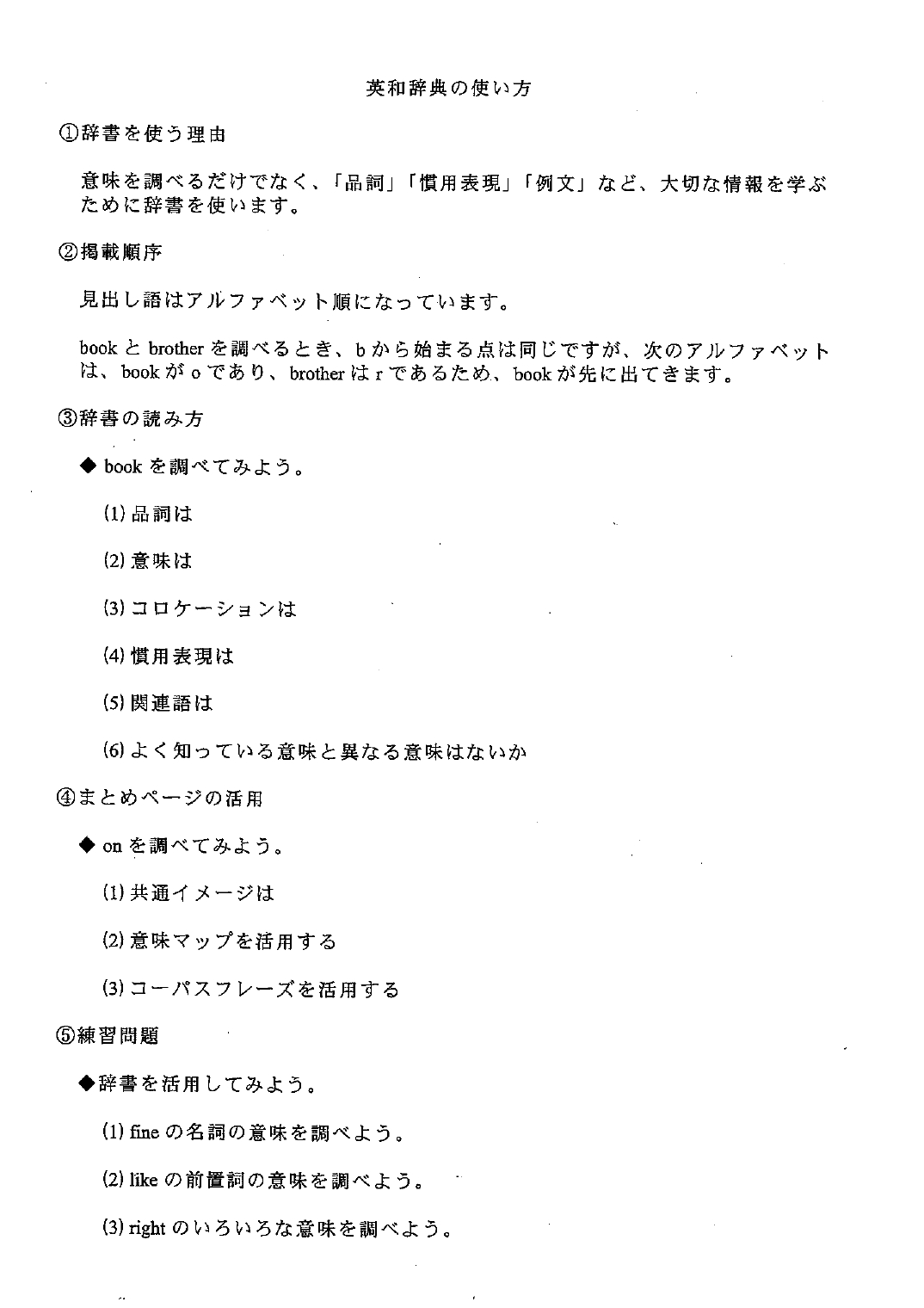 そもそも、辞書を有効活用するためには最低限二つの知識を持っていなければなりません。「①アルファベットの字形と順番に関する知識」「②品詞の知識」です。このうち、①については小学校の英語授業が始まったことで、中学入学時には既に知っていることが前提で話を進める方も多いかもしれませんが、中学受験をしてきた本校生徒でも全員が完全に習得できているわけではないので、中学の最初に丁寧に導入する必要があると思います。特に、アルファベット順を覚える作業は、ともすれば、A~Zのアルファベットを歌に合わせて数回唱えて、テストで確認して終わりとなりかねず、順番は分かるけれども、毎回ABCの歌を唱えないと前後関係が分からないという状態の生徒も多いかもしれません。現在担当している学年では、『これからの英語の文字指導』(手島良著、研究社)を参考に、アルファベットは正順(A~Z)、逆順(Z~A)のどちらでも言えるように練習をすることで、それが後々辞書を引く時に役立つことを伝えました。