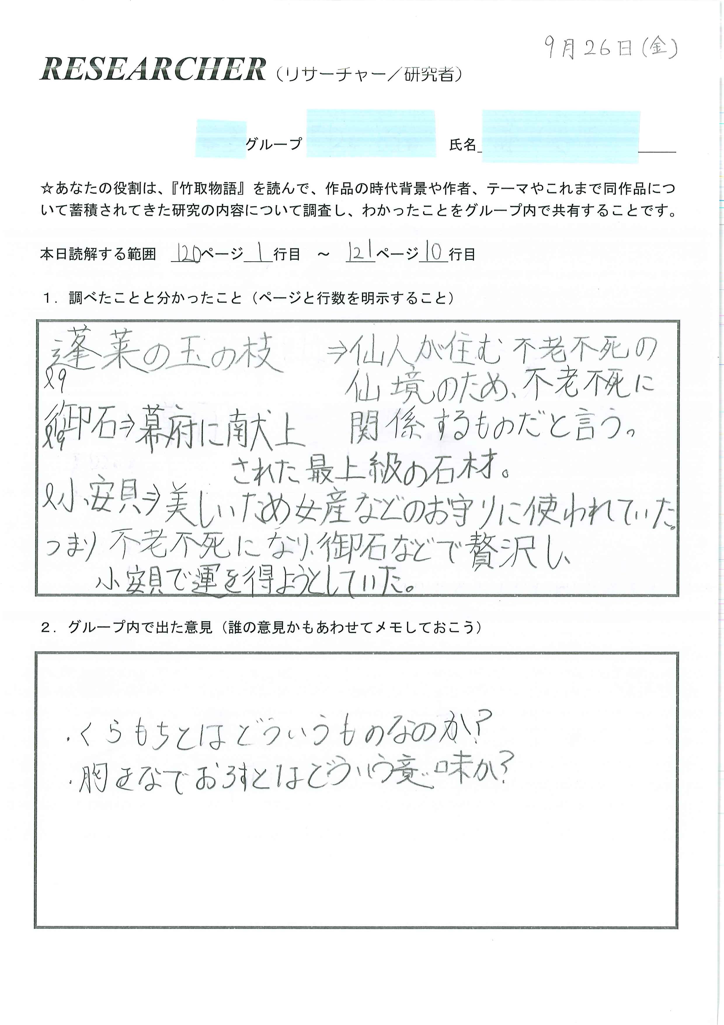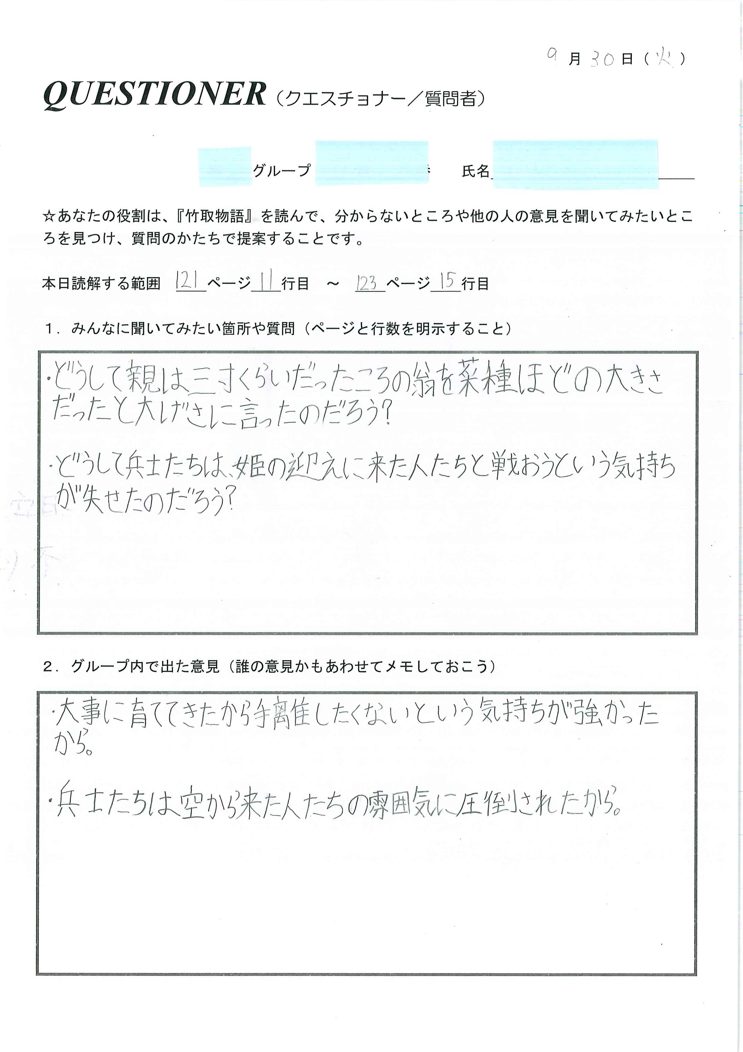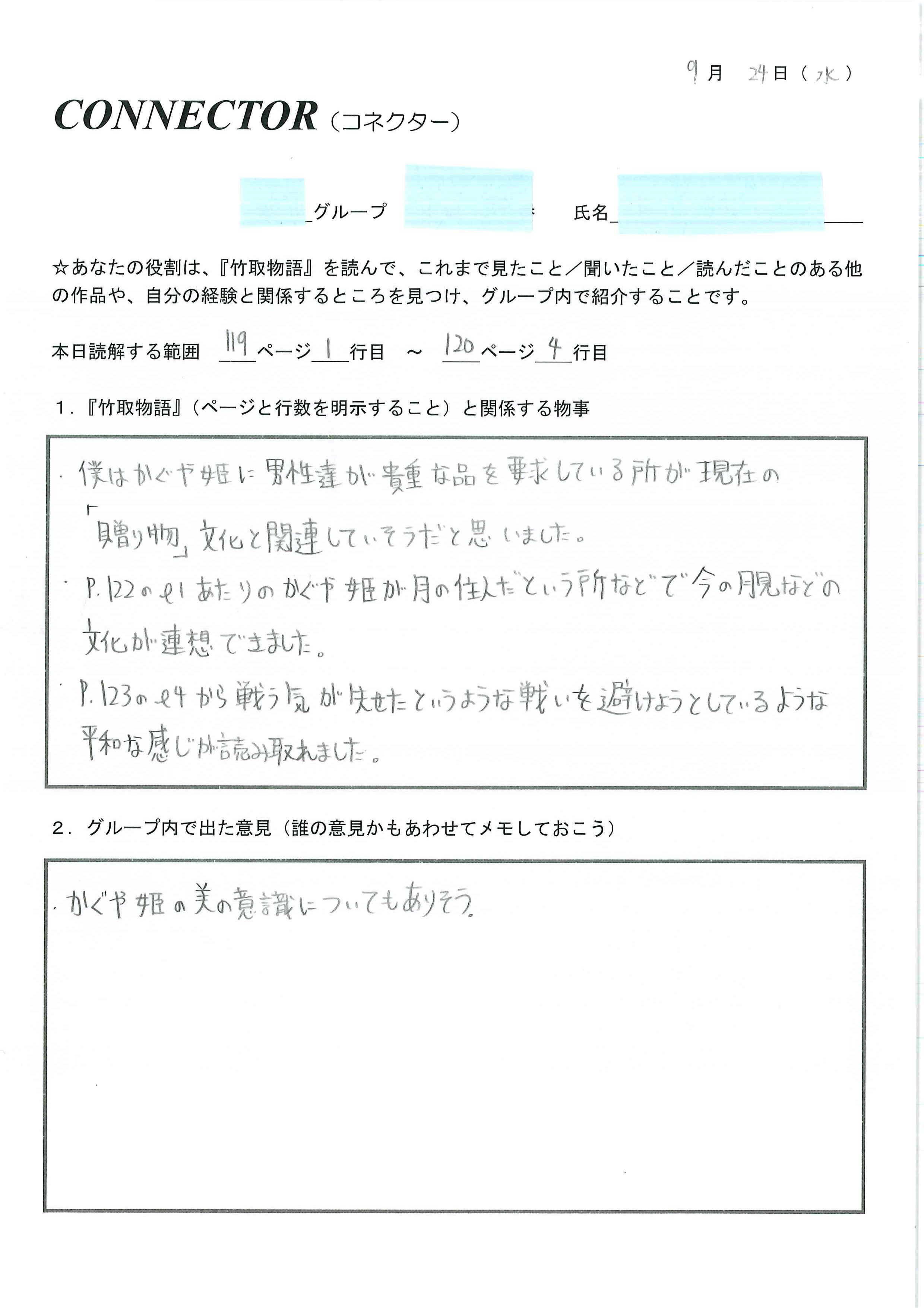 第1時 「竹取物語」を読み、5人程度のグループで感想を共有する。LCの説明をもとに、役割分担を行う。