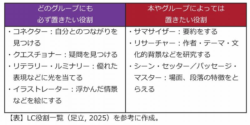 LCは一人読みのワークとグループでの話し合いとによって構成される学習方略です。一人読みは一人一役で、一回の授業ごとに役割を交換します。本実践では、生徒たちが自分の役割の内容を確認しながら取り組むことができるように「役割シート」を用意しました。「役割シート」には、自分の意見や疑問を記入する欄と、グループのメンバーの意見を記入する欄を設けました。LCの各回の終わりには、次回の役割分担とリフレクションを兼ねた〈問い〉の引継ぎを行います。
