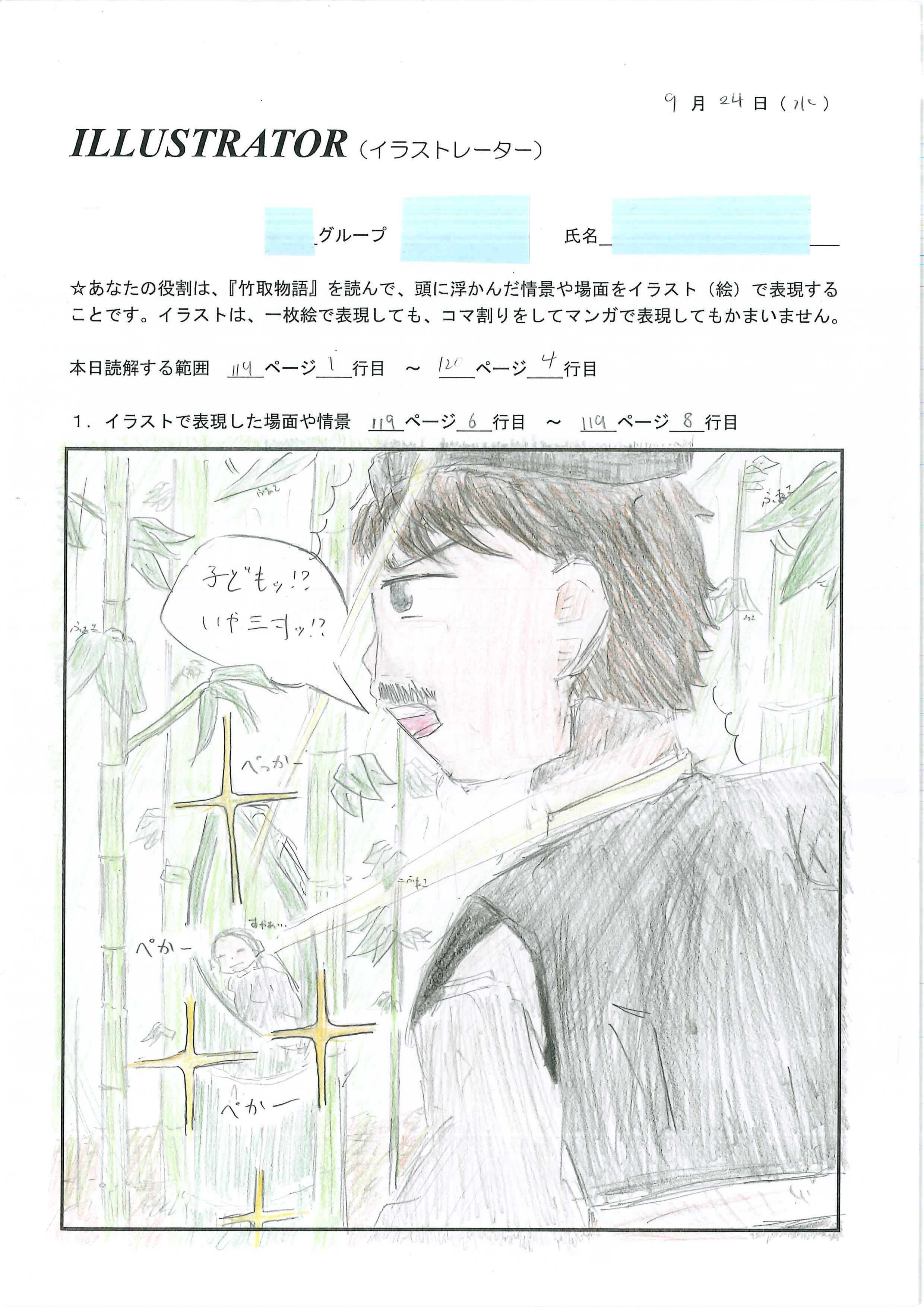 〈指導上のポイント〉 ・LCでは、「よくわからないところ」「みんなの意見を聞いてみたいところ」「ひっかかりを感じるところ」をたくさん見つけることが大切であると声がけする(イラストレーター役もイラストが上手である必要はない)。 ・教員が各グループを回りながら、問いのヒントを示してもよい(例:「竹取物語」と似たような構造の話は他にあるか、かぐや姫の成長速度は何になぞらえられているか、など)。 |